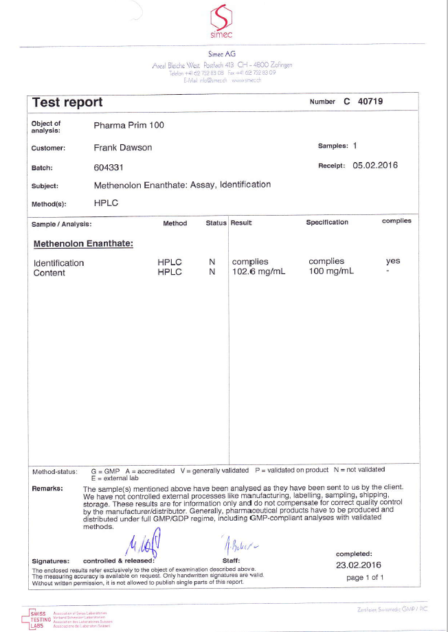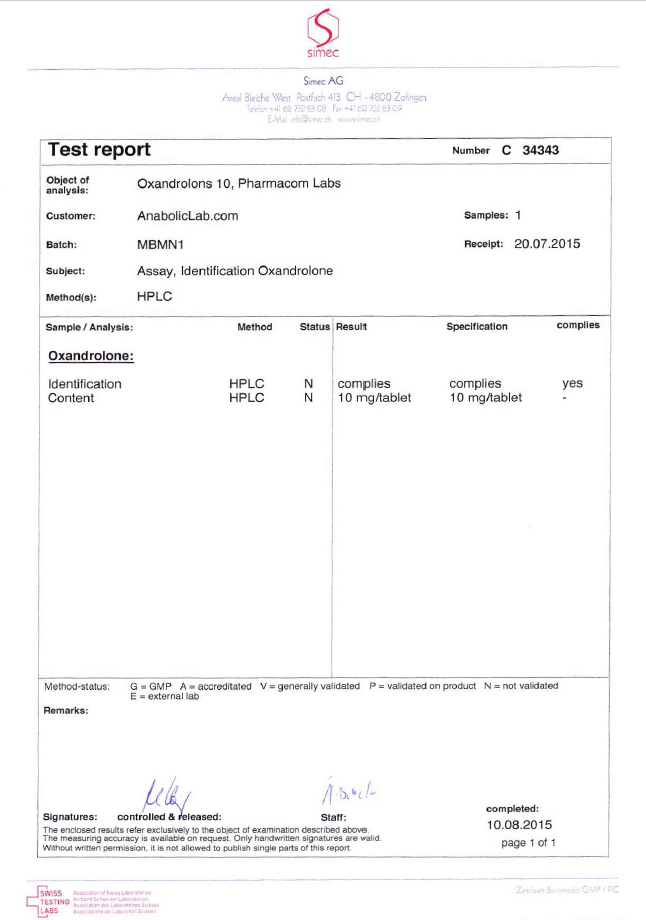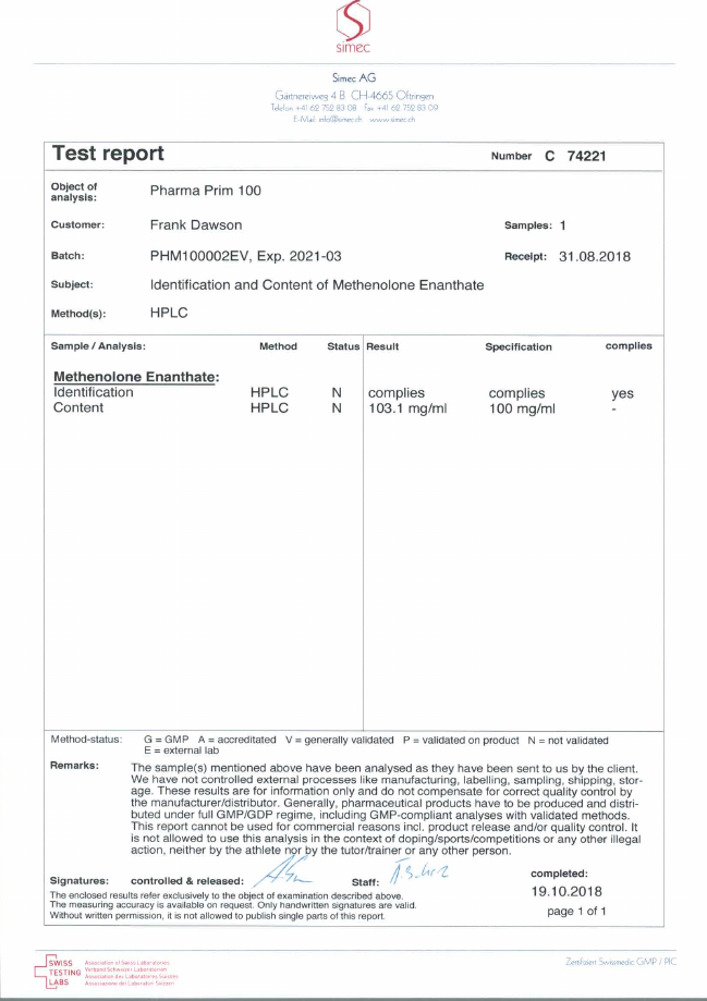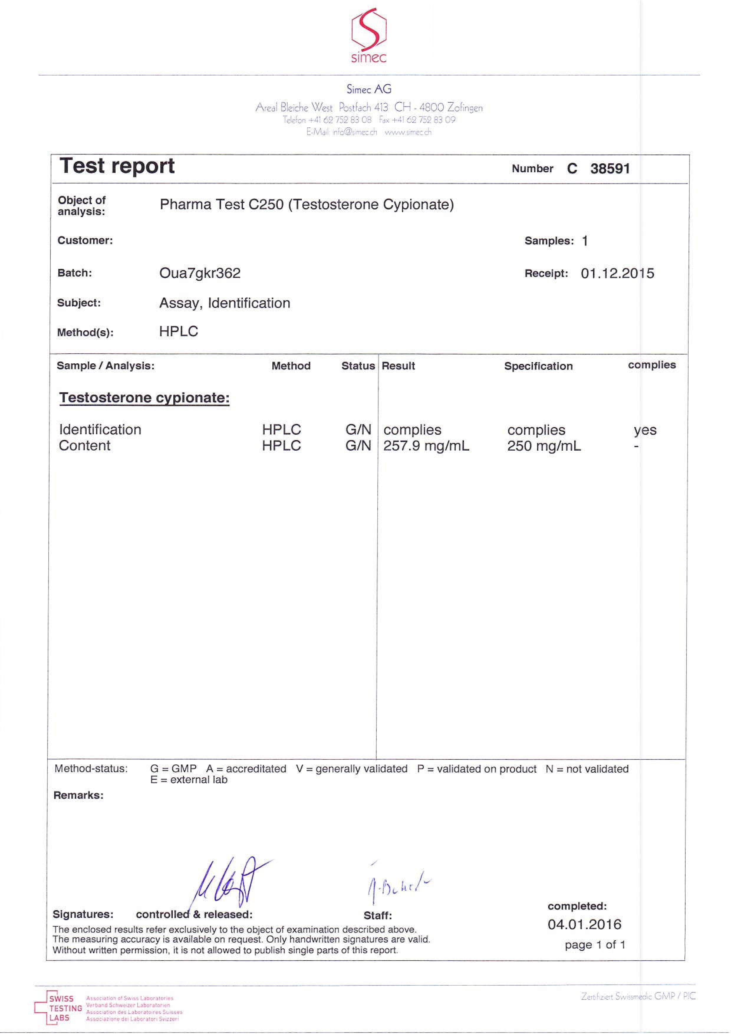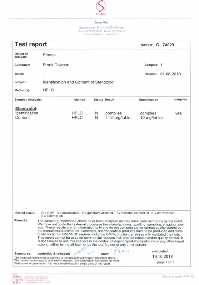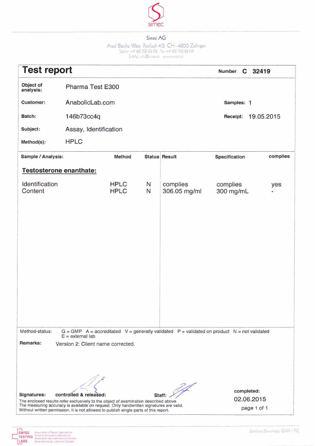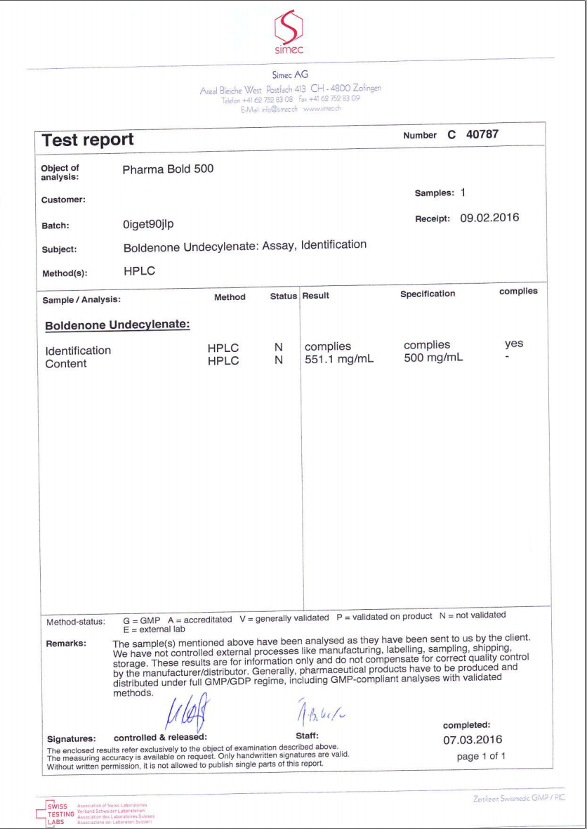 Todos os testes cromatográficos foram realizados por um laboratório independente, acreditado e certificado pelas GMP, a Simec AG (www.simec.ch). Todos os resultados são verificáveis! Cada relatório contém seu número individual; por exemplo, C34804 para Boldenone Undecylenate. Você pode, a qualquer momento, entrar em contato diretamente com a Simec e informar o número do relatório específico para verificar a autenticidade do documento.