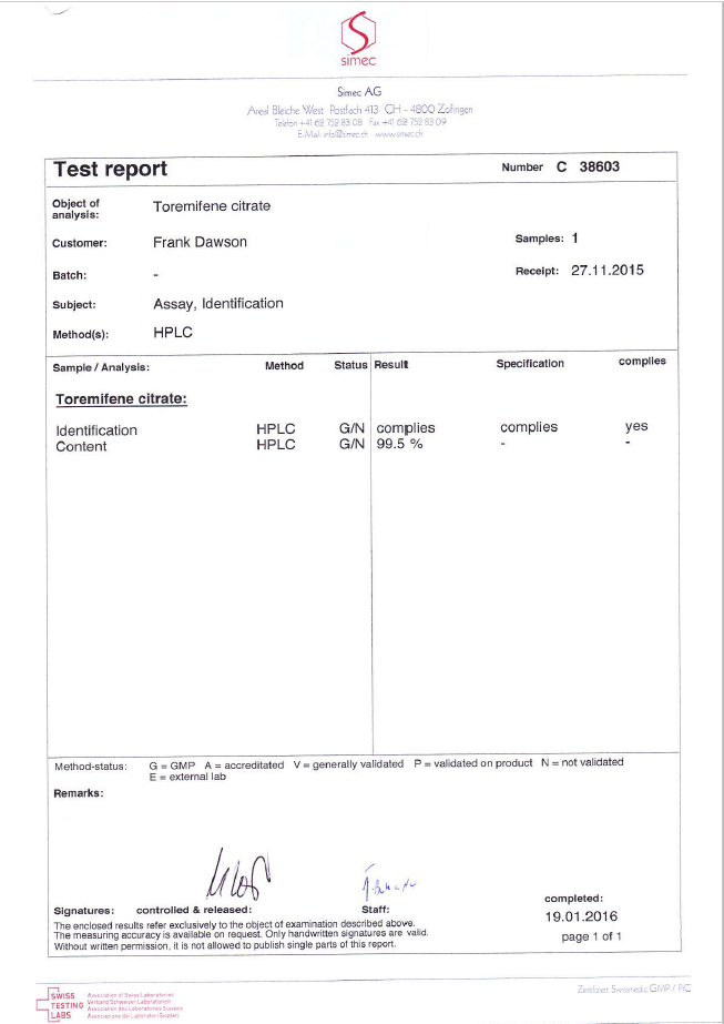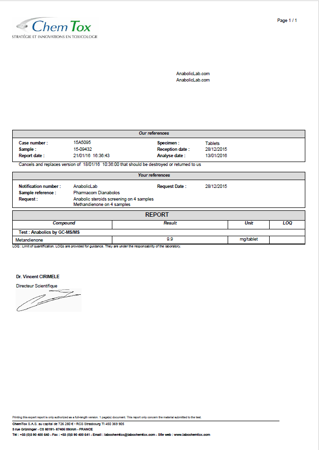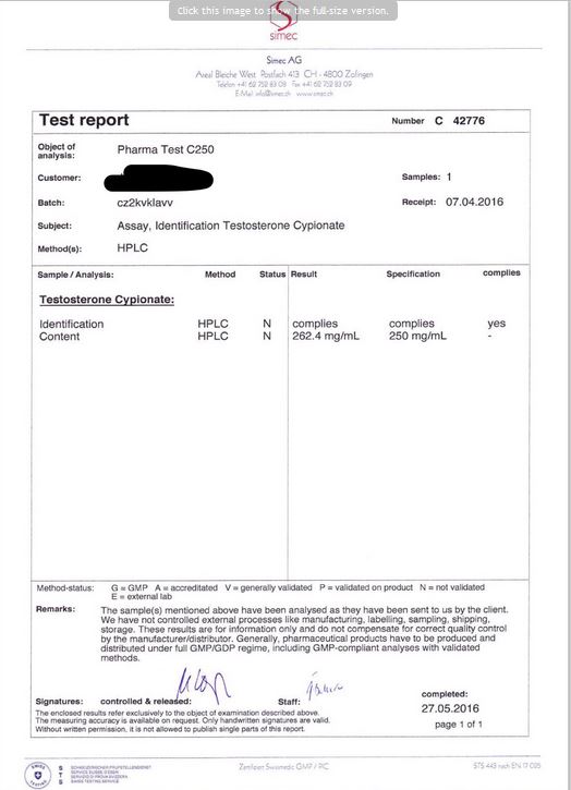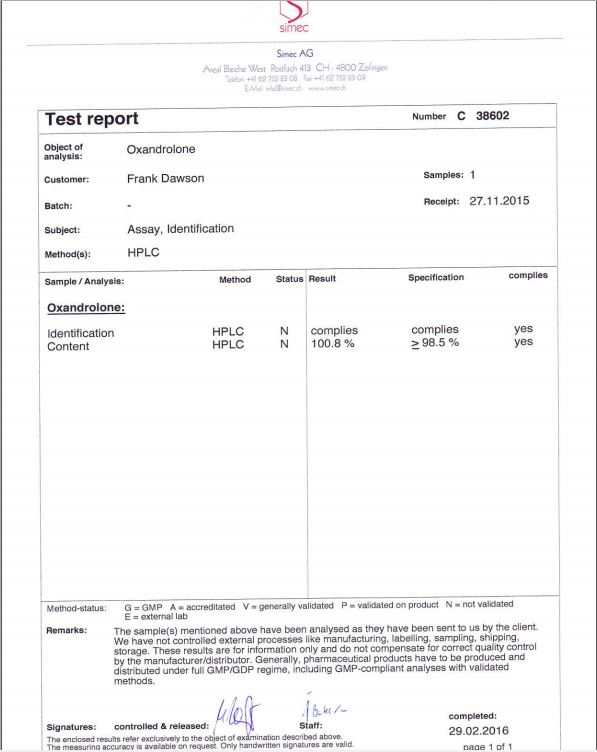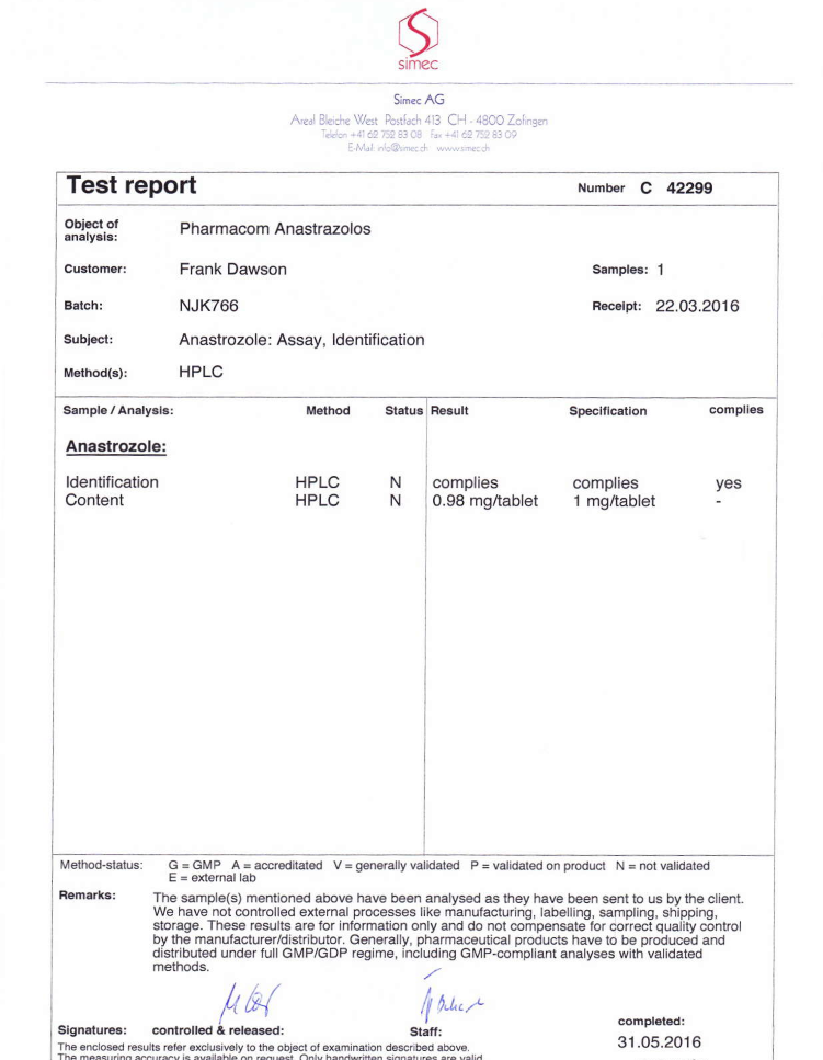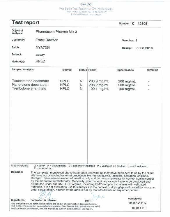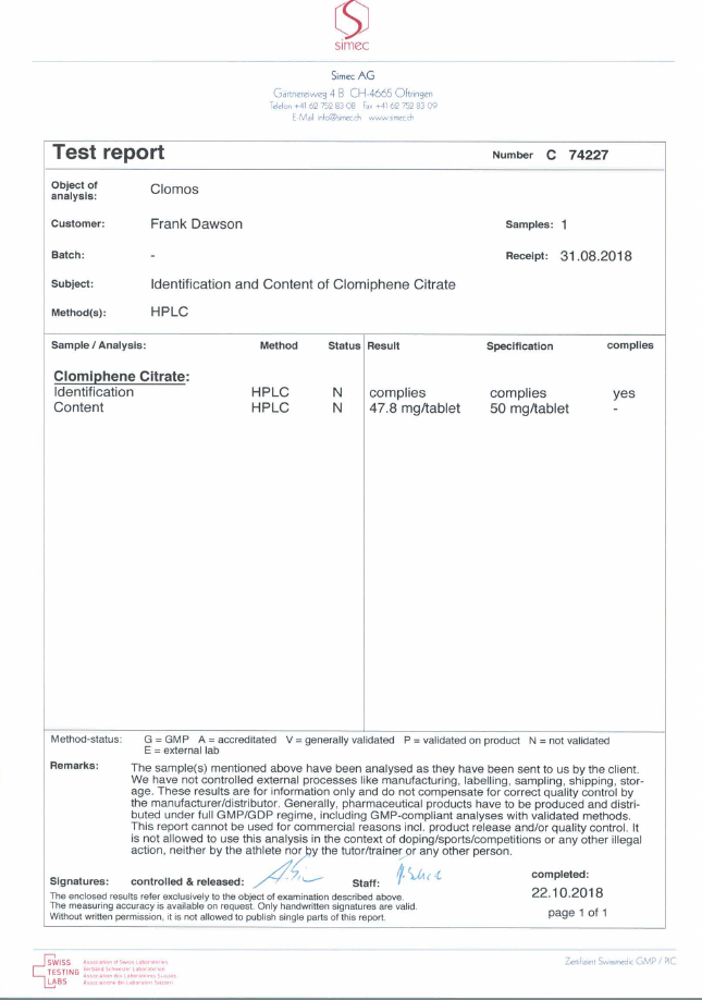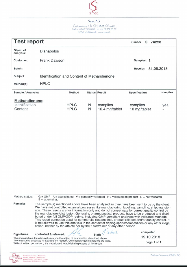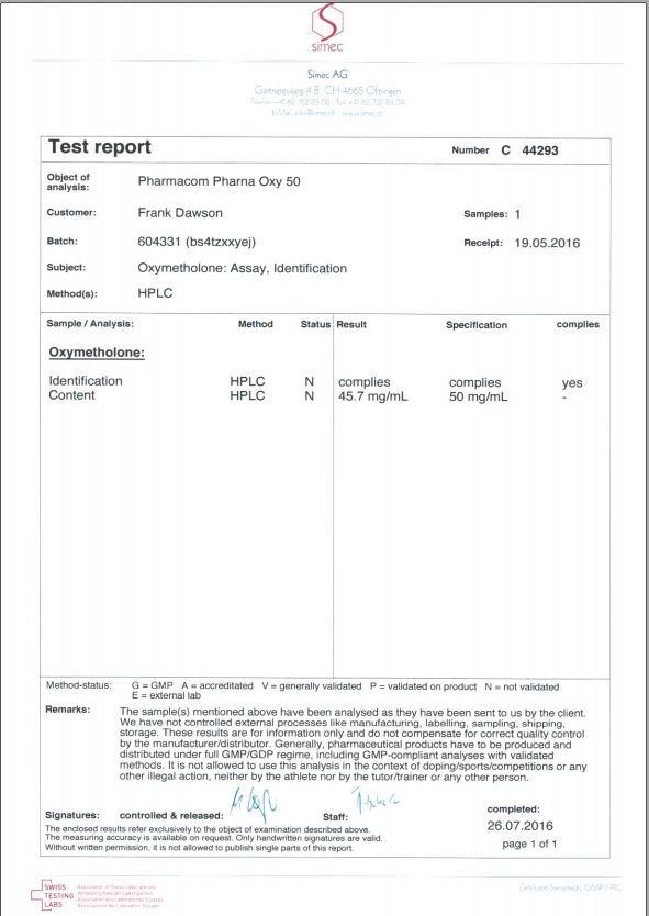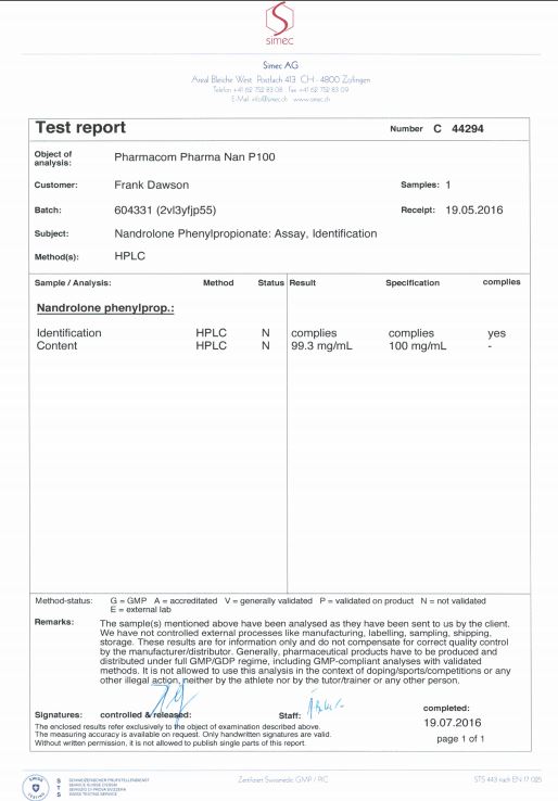 Todos os testes cromatográficos foram realizados por um laboratório independente, acreditado e certificado pelas GMP, a Simec AG (www.simec.ch). Todos os resultados são verificáveis! Cada relatório contém seu número individual; por exemplo, C34804 para Boldenone Undecylenate. Você pode, a qualquer momento, entrar em contato diretamente com a Simec e informar o número do relatório específico para verificar a autenticidade do documento.