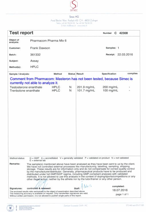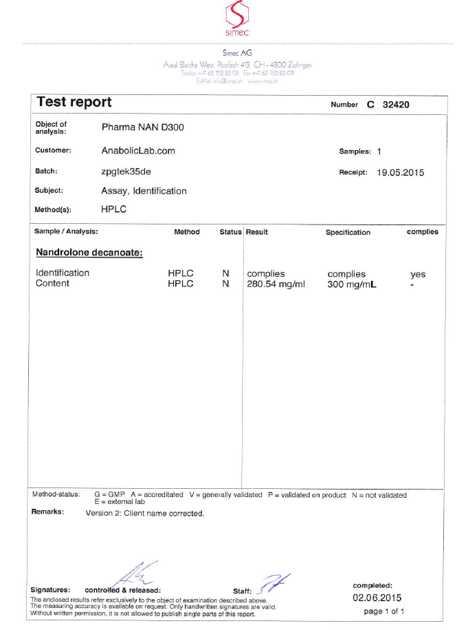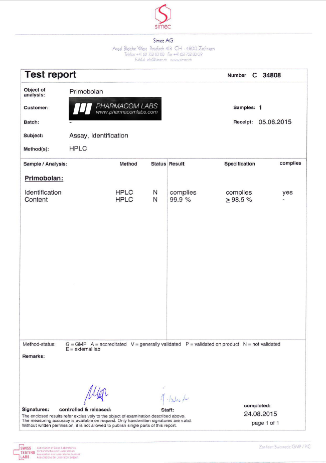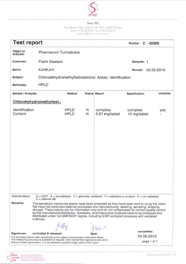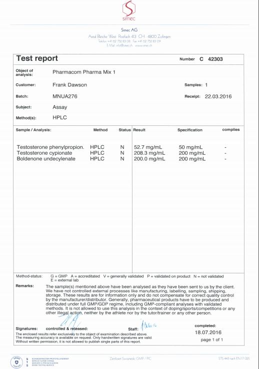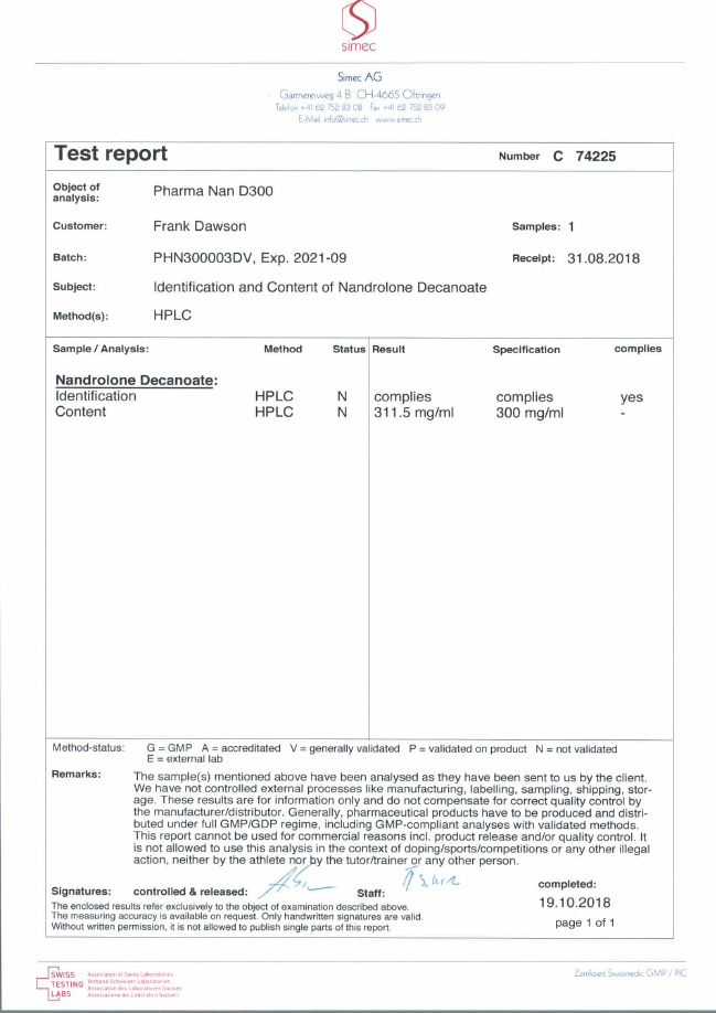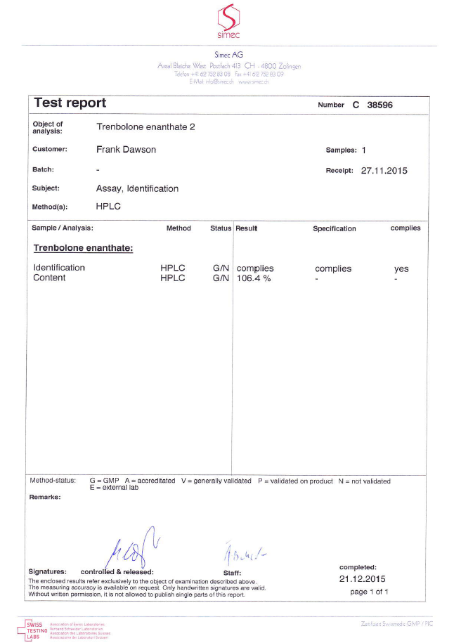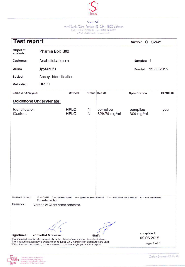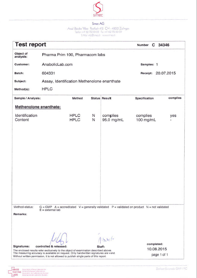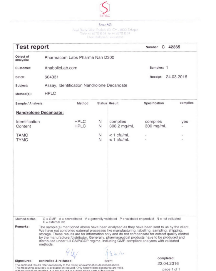 Todos os testes cromatográficos foram realizados por um laboratório independente, acreditado e certificado pelas GMP, a Simec AG (www.simec.ch). Todos os resultados são verificáveis! Cada relatório contém seu número individual; por exemplo, C34804 para Boldenone Undecylenate. Você pode, a qualquer momento, entrar em contato diretamente com a Simec e informar o número do relatório específico para verificar a autenticidade do documento.