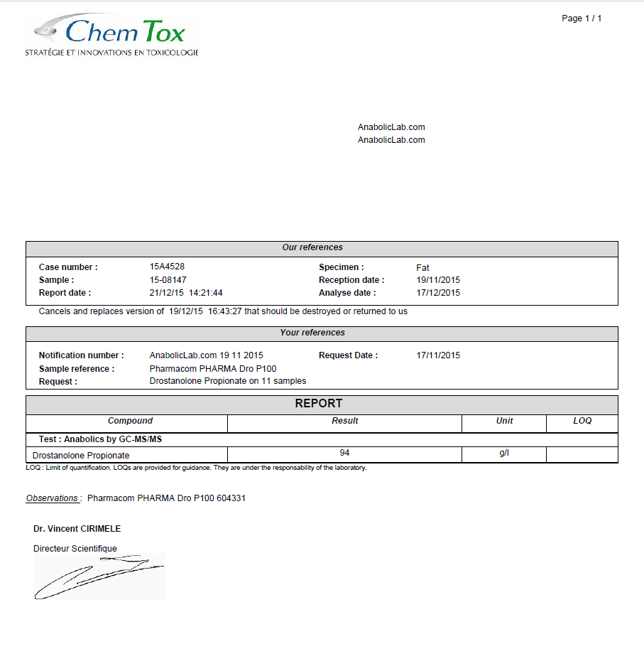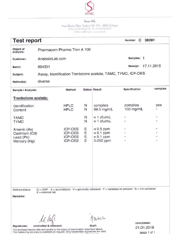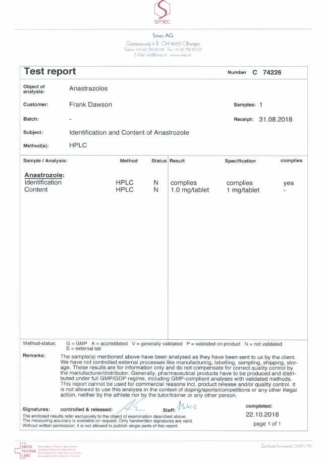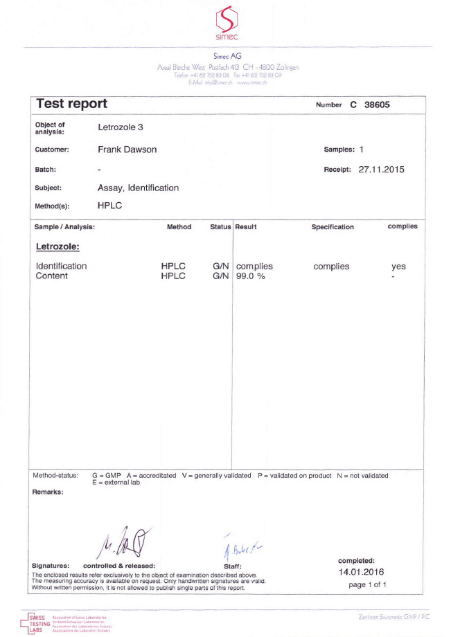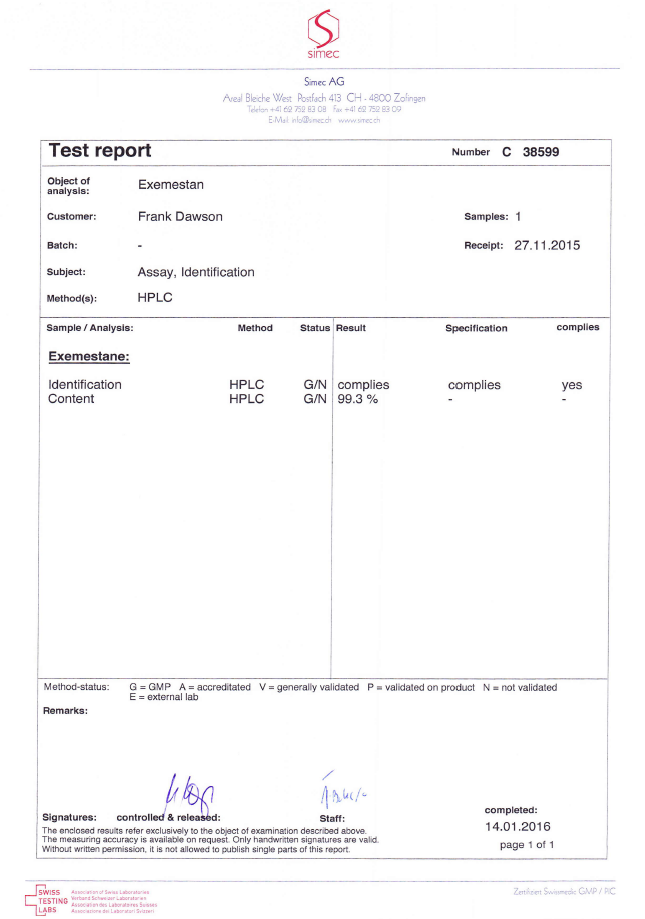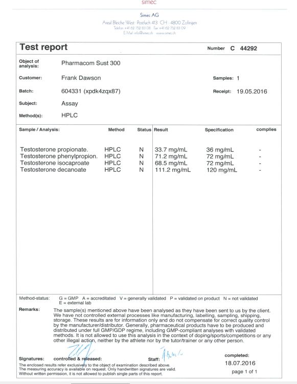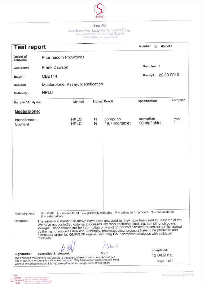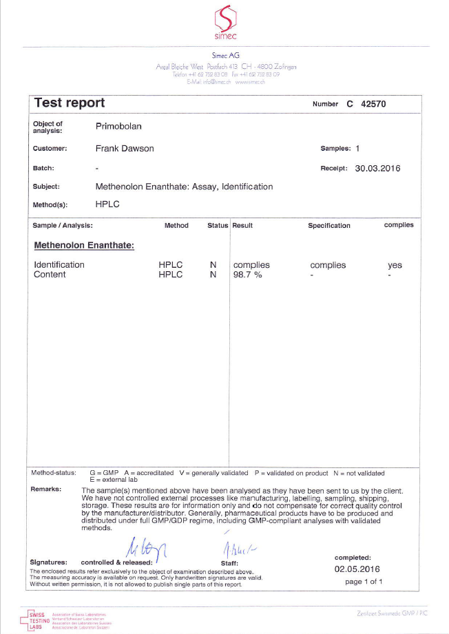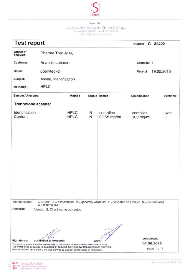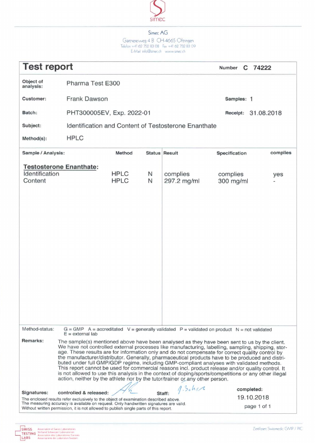 Todos os testes cromatográficos foram realizados por um laboratório independente, acreditado e certificado pelas GMP, a Simec AG (www.simec.ch). Todos os resultados são verificáveis! Cada relatório contém seu número individual; por exemplo, C34804 para Boldenone Undecylenate. Você pode, a qualquer momento, entrar em contato diretamente com a Simec e informar o número do relatório específico para verificar a autenticidade do documento.
